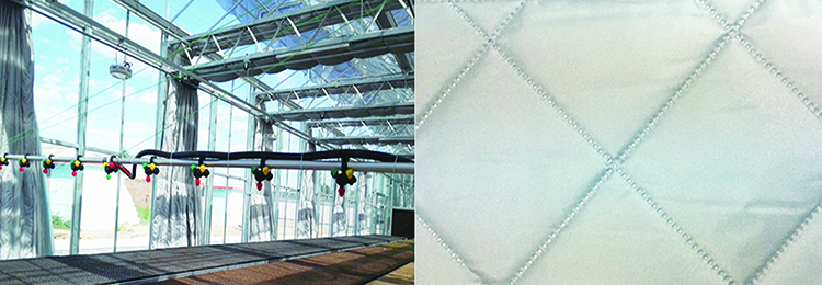 智能溫室內保溫被簾采用兩層化纖面料經單面涂銀處理,中間保溫層采用120克好質量棉加工而成,成品重量為220克,幅寬4.3米,長度可定制。